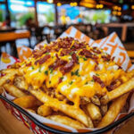 SKIN-ON FRIES LOADED WITH NACHO CHEESE, SMOKED BACON, SPRING ONION AND SOUR CREAM, TOPPED WITH HARD CHEESE SHAVING