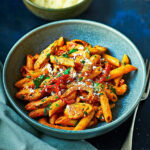 PENNE PASTA WITH PULLED CHICKEN BREAST IN A CREAMY SAUCE WITH ONION AND MIXED PEPPERS, FINISHED WITH CORIANDER, SPRING ONION AND LIME