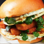 SERVED IN A SOFT GLAZED BUN WITH MISO MAYO, LETTUCE AND CHOPPED PICKLE & ONION, WITH SKIN-ON FRIES OR SIDE SALAD