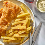 HAND BATTERED FISH WITH SKIN-ON FRIES, TARTARE SAUCE AND YOUR CHOICE OF PEAS.WITH S