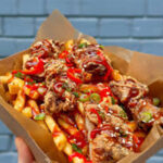 SKIN-ON FRIES LOADED WITH CURRY SAUCE, SPRING ONION AND A SWEET & SOUR PICKELED ONION
